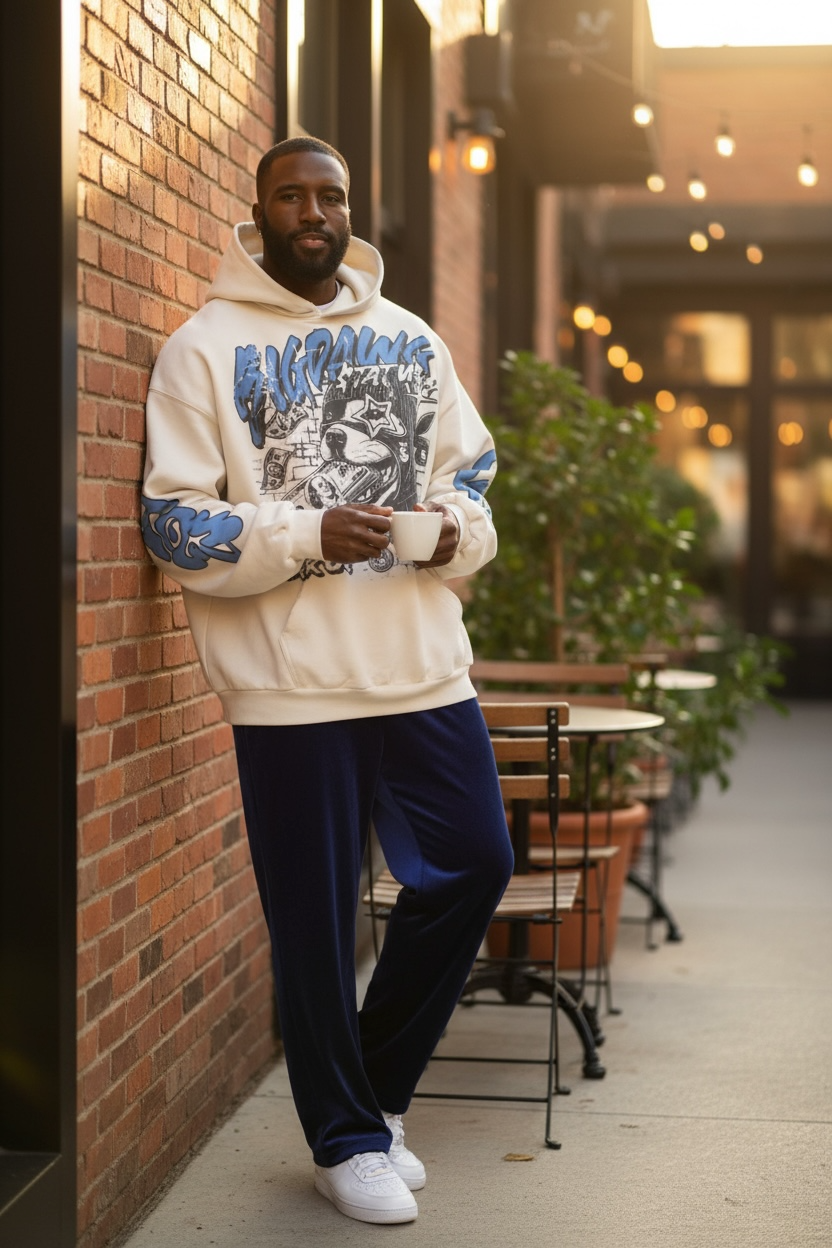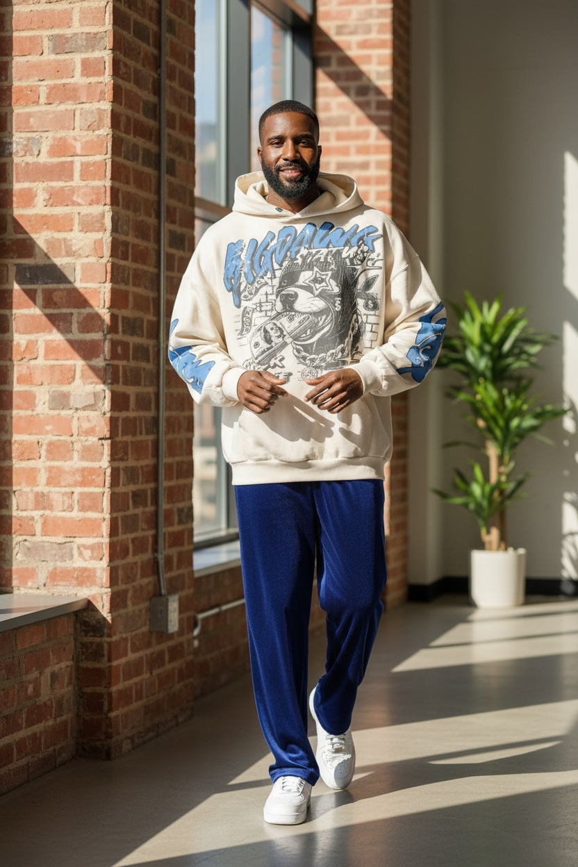 This hoodie features a boxy silhouette that delivers an effortlessly street-ready look. With its distressed detailing on the hood, bold raw-edge pocket design, and frayed cuffs and hem, paired with a subtle vertical tonal gradient, it achieves that lived-in aesthetic. The reactive-dyed fabric maintains color vibrancy, while the intentionally destroyed and sun-faded treatment adds urban character, making every piece uniquely rebellious.