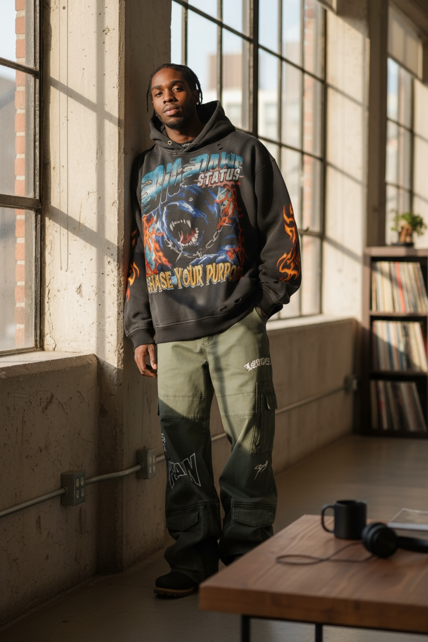 This 100% cotton hoodie pairs a sun-faded wash with distressed detailing to capture authentic vintage streetwear energy. Oversized proportions and grunge-inspired touches make it ideal for layering or wearing as a bold statement piece, blending comfort, casual ease, and standout appeal in modern everyday fashion.